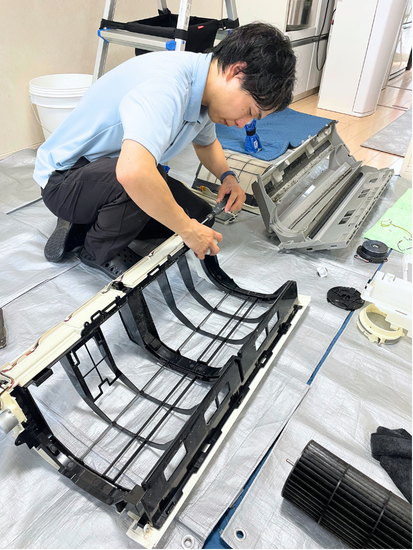 エアコンを完全に分解し、普段は手の届かないドレンパンの内側・送風ファン・アルミフィンの裏側まで徹底的に洗浄できる事を知り、